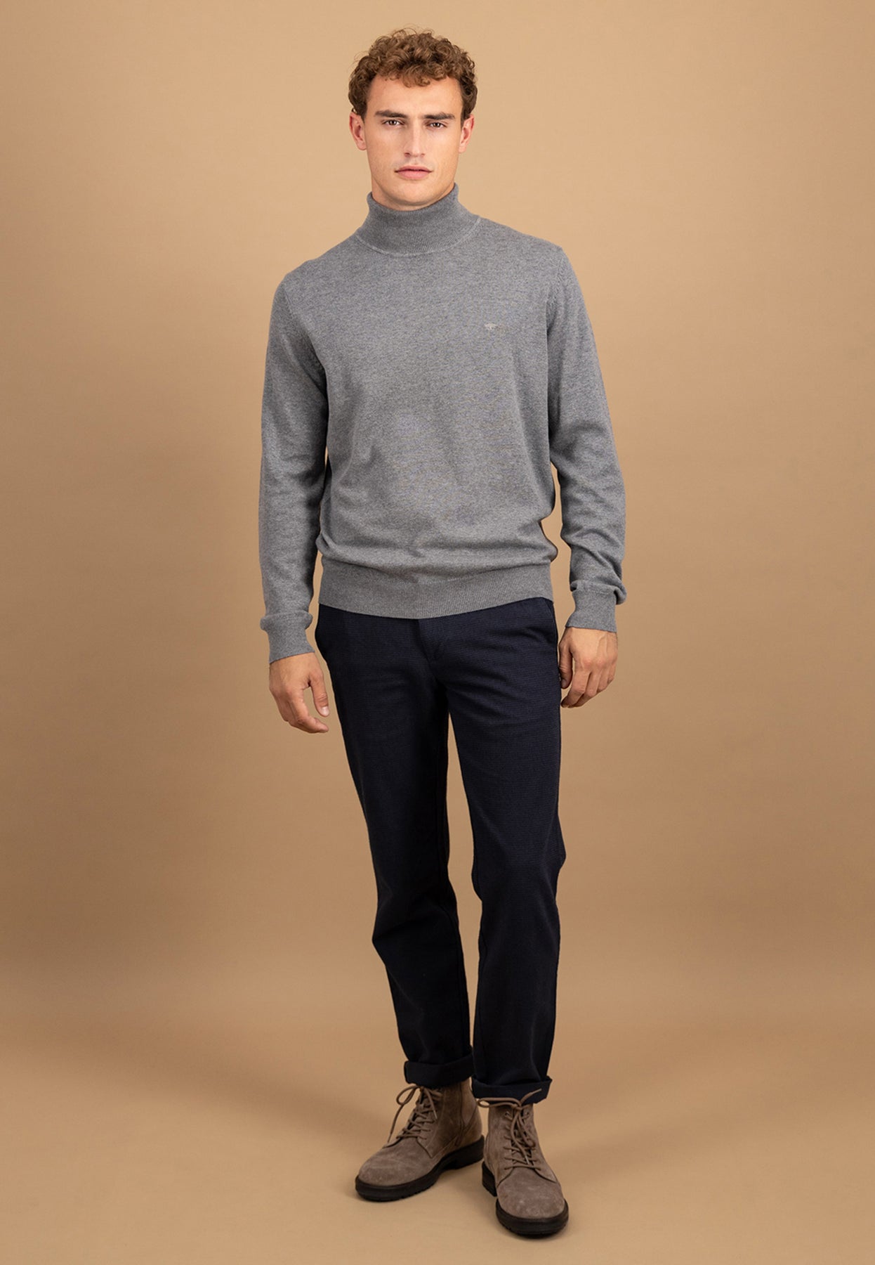 Dieser Rollkragenpullover aus 100 % Baumwolle ist ein stilvoller Klassiker für kühle Tage. Der weiche Strick trägt sich angenehm auf der Haut und bietet natürliche Atmungsaktivität – ideal für den Alltag oder das Büro.