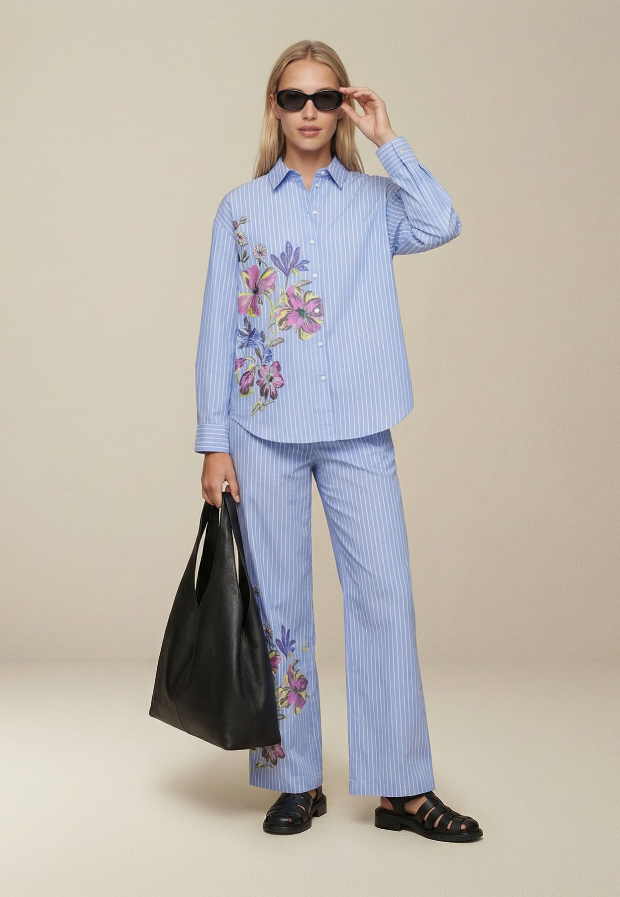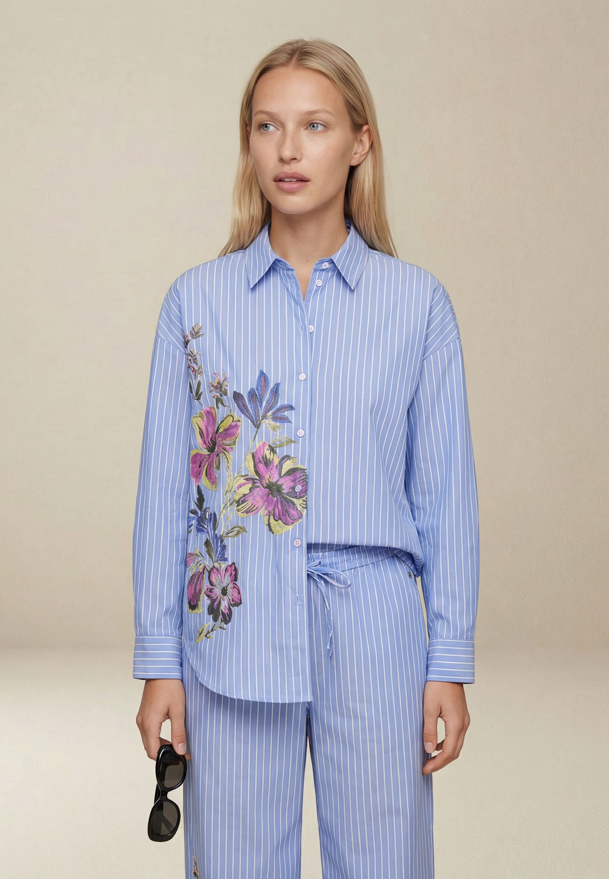 Diese Bluse verbindet klassische Streifen mit einem ausdrucksstarken, floralen Print zu einem modernen Look. Der hochwertige Baumwollstretch sorgt für angenehmen Tragekomfort und eine optimale Passform. Der klassische Hemdkragen und die durchgehende Knopfleiste verleihen dem Design eine zeitlose Note, während das florale Motiv einen stilvollen Akzent setzt. Vielseitig kombinierbar – ideal für feminine Everyday-Outfits mit besonderem Detail.