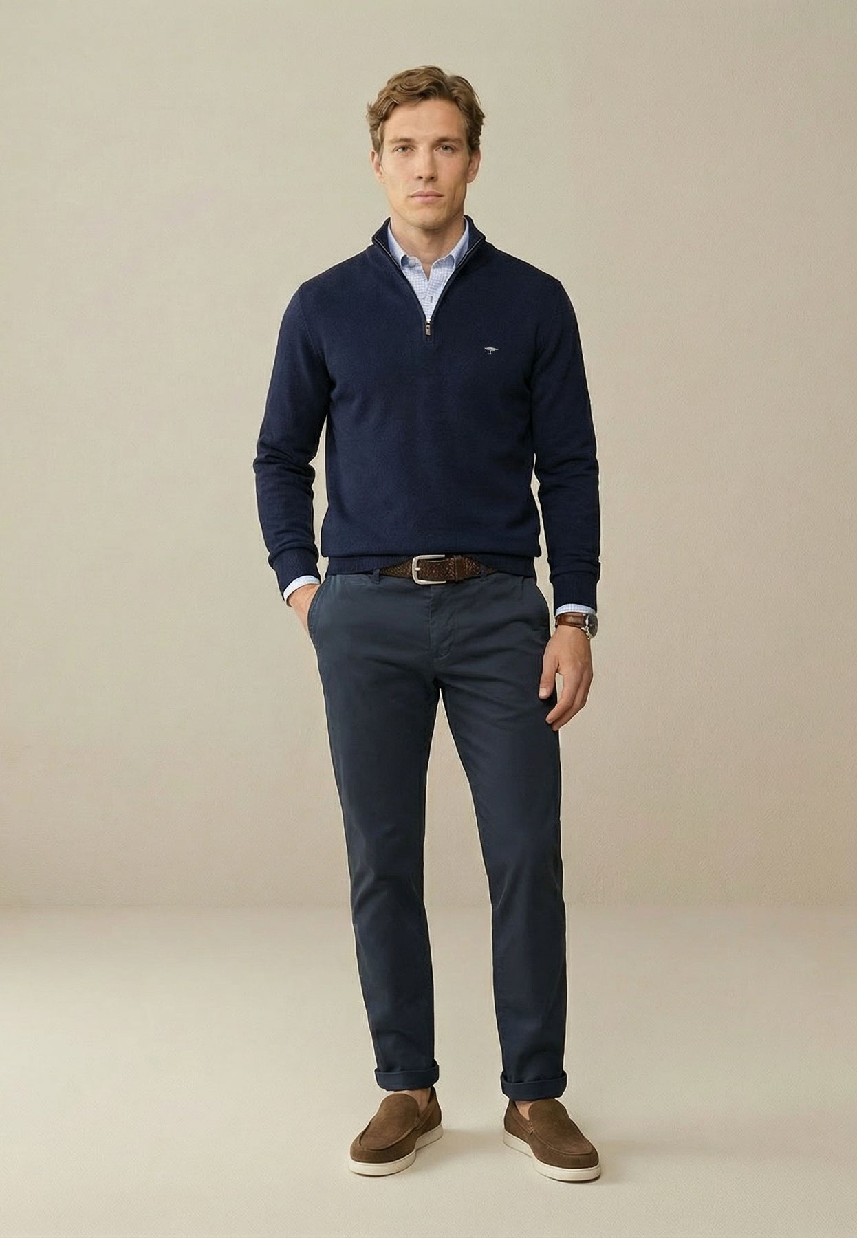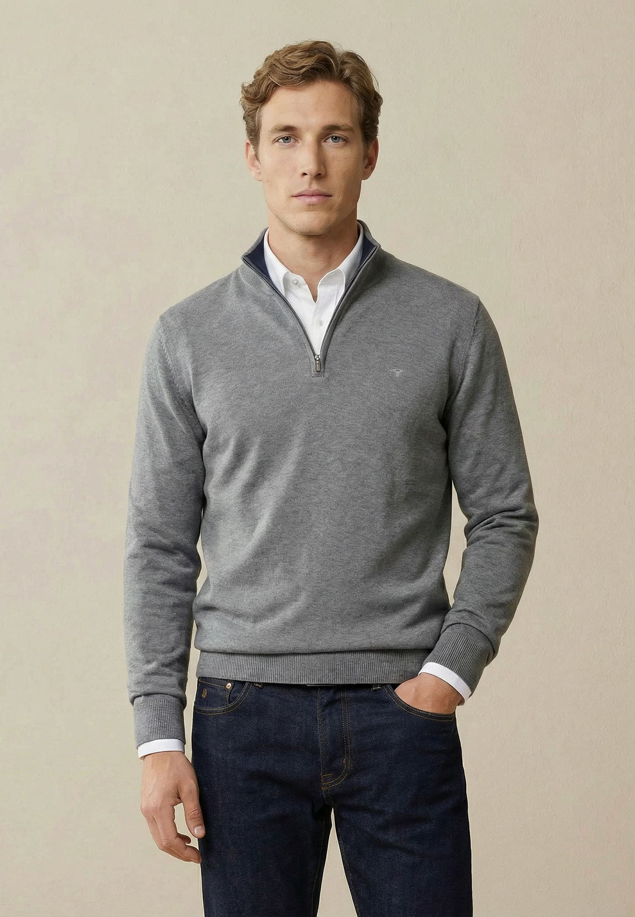 Dieser klassische Troyer überzeugt mit klarer Linienführung und hochwertigen Details. Der hohe Kragen mit Reißverschluss sorgt für angenehme Wärme und lässt sich je nach Anlass offen oder geschlossen tragen. Die dezente Logostickerei auf der Brust rundet das Design stilvoll ab.