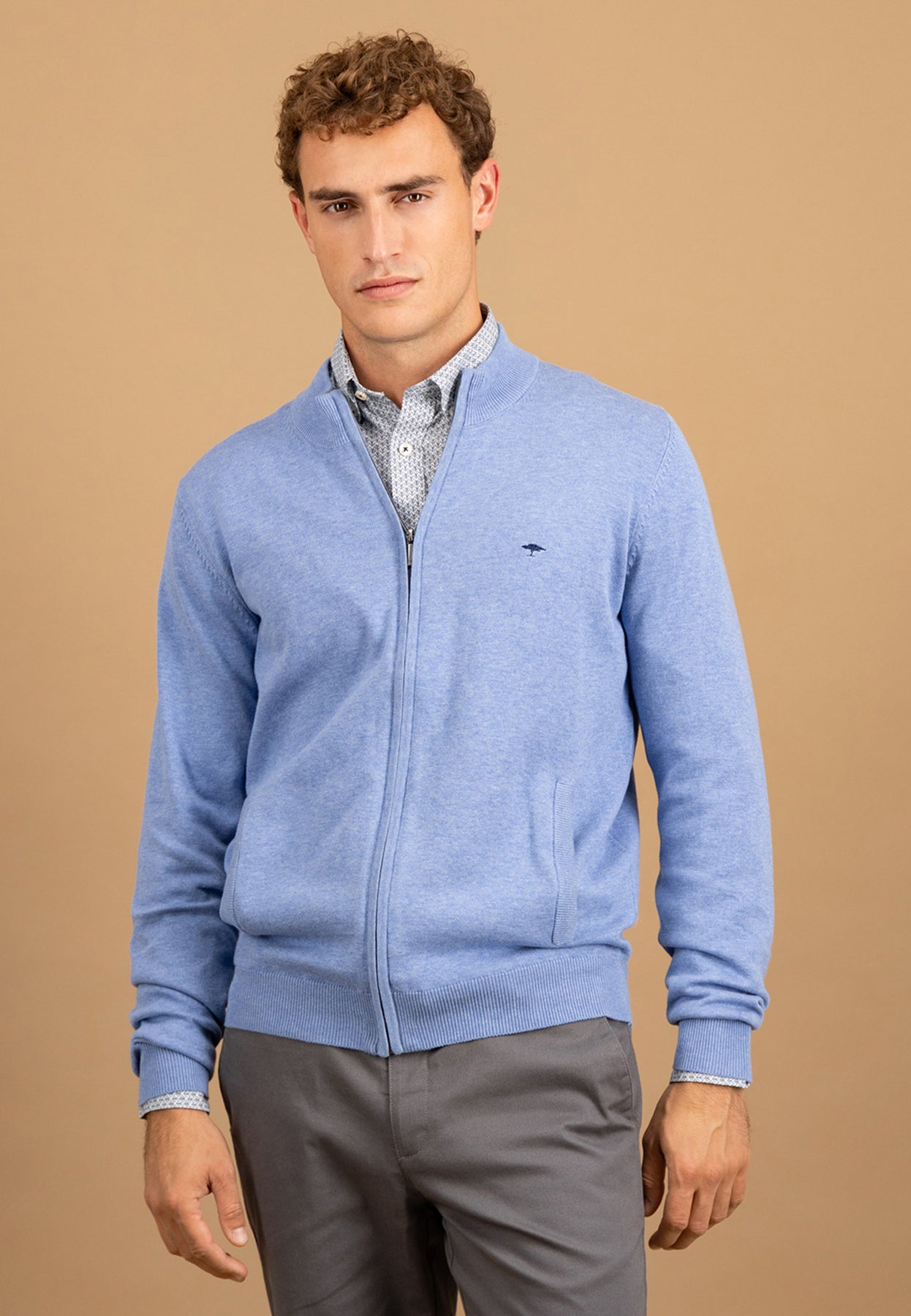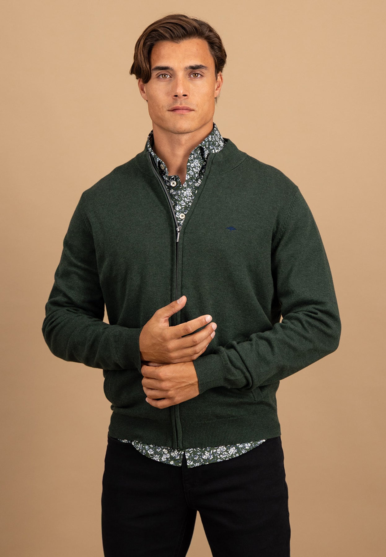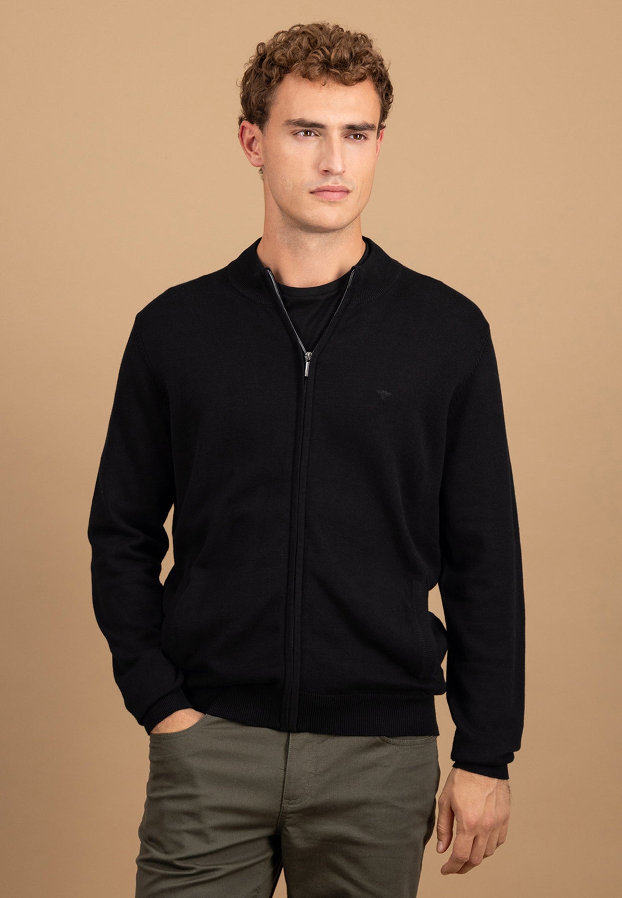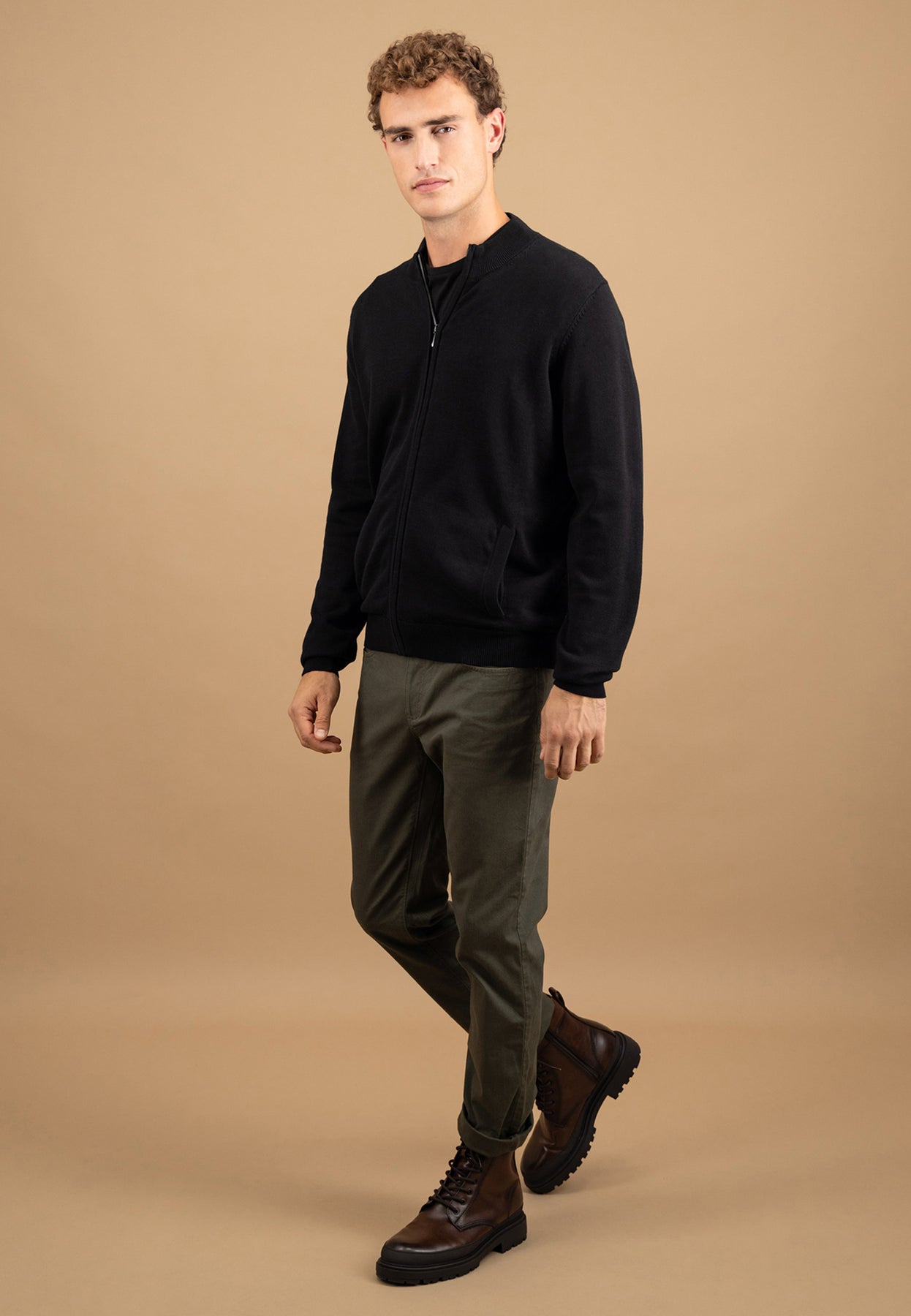 Diese Strickjacke aus 100 % Baumwolle verbindet zeitlosen Stil mit funktionalem Komfort. Der doppelte Reißverschluss und der fein gerippte Stehkragen sorgen für eine gepflegte, moderne Silhouette – ideal für den Alltag oder das Büro.