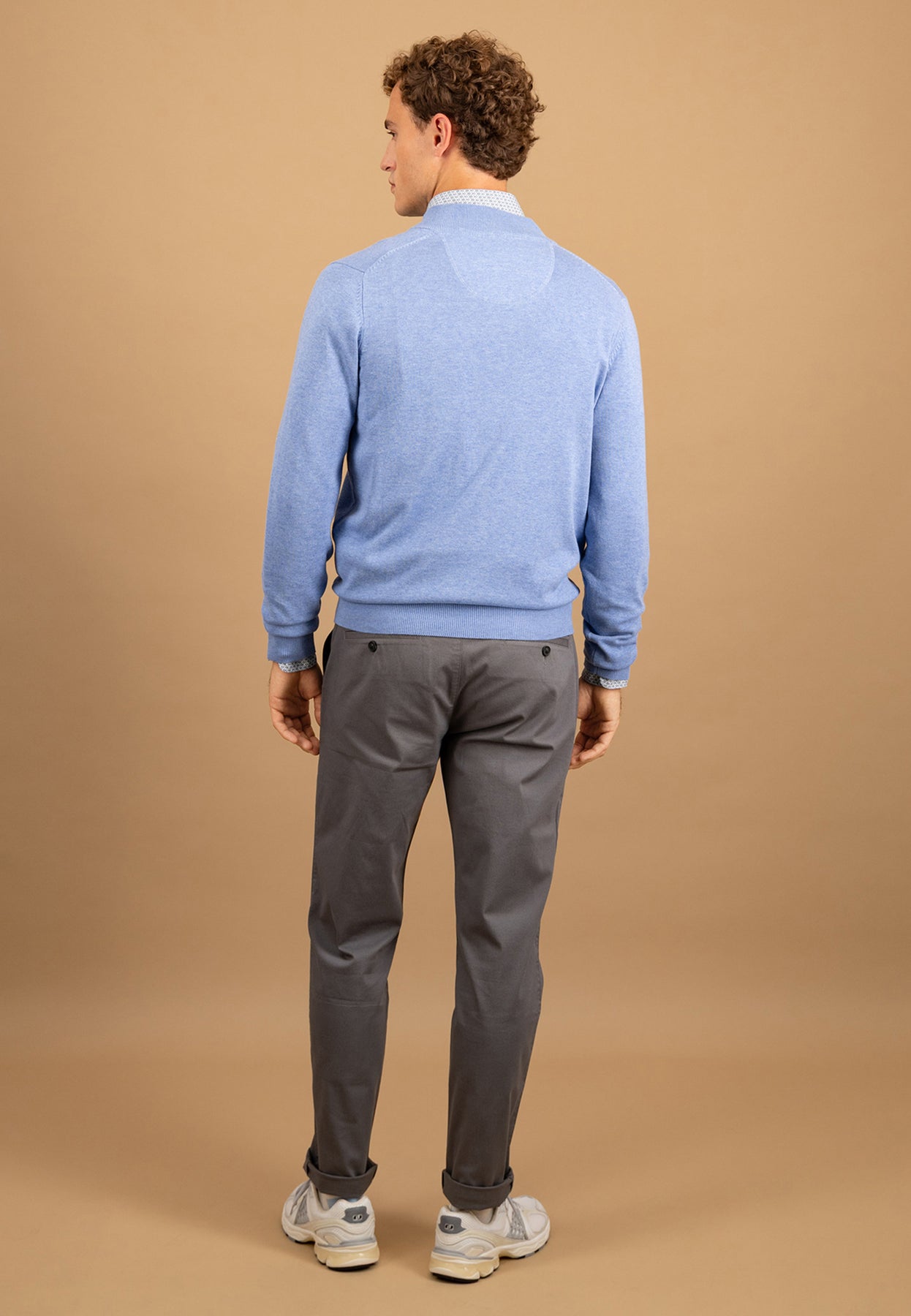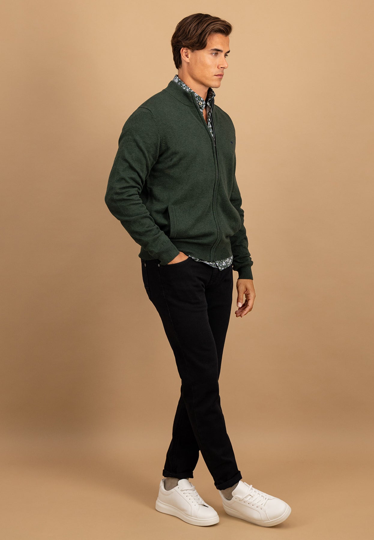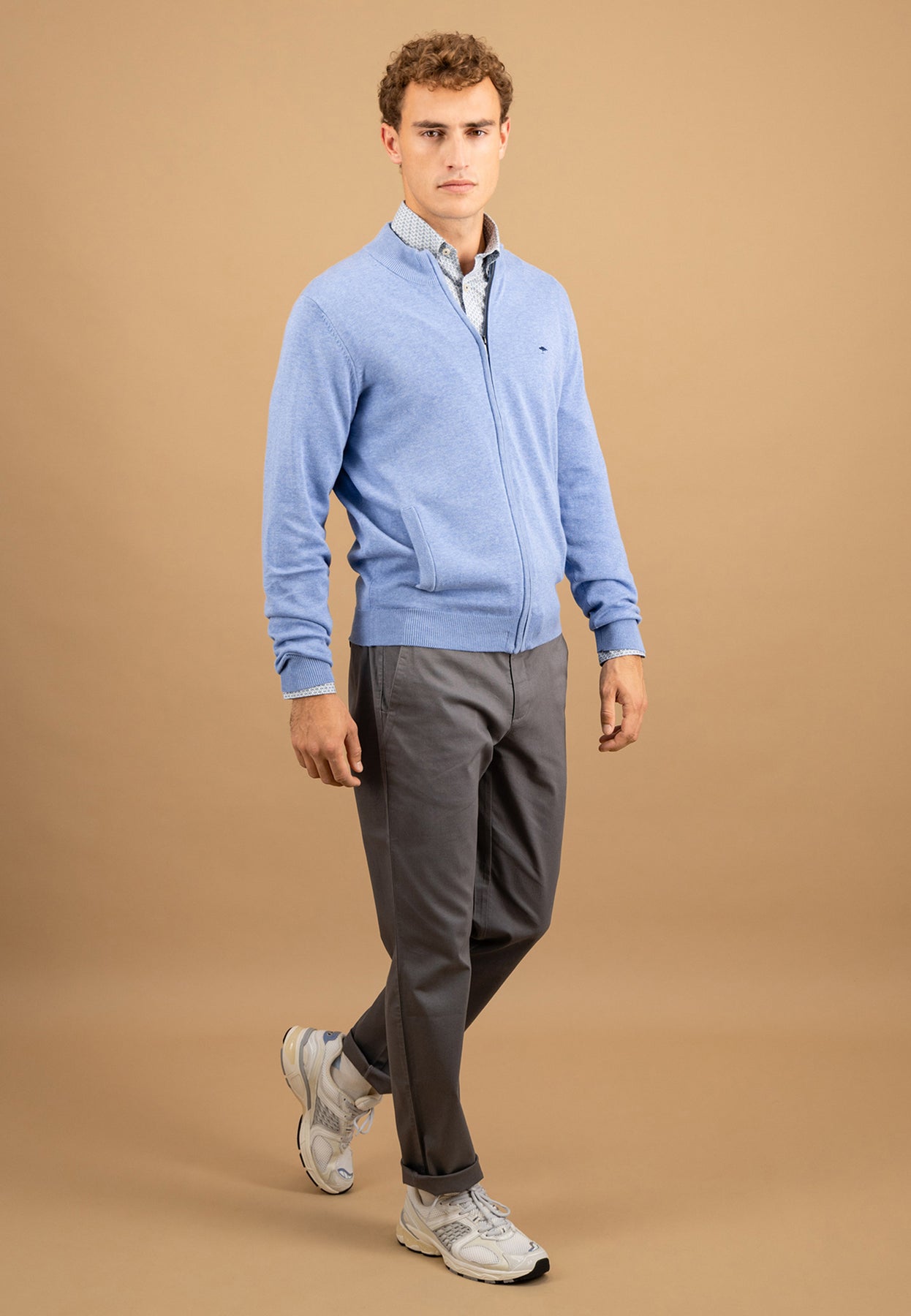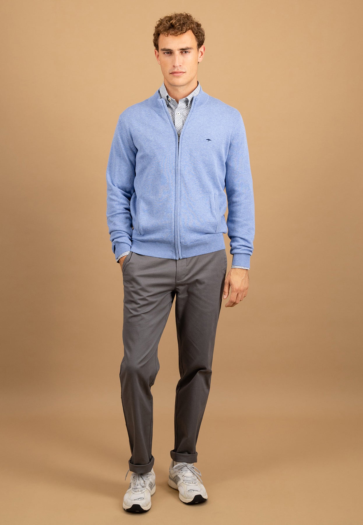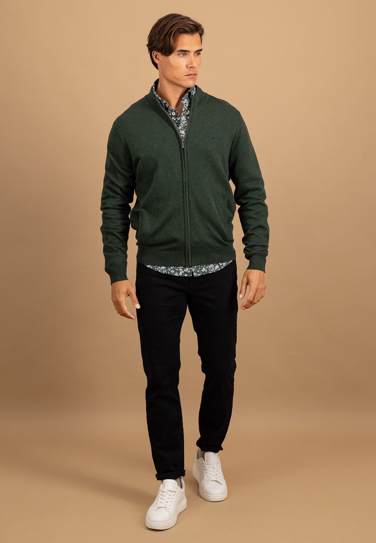 Diese Strickjacke aus 100 % Baumwolle verbindet zeitlosen Stil mit funktionalem Komfort. Der doppelte Reißverschluss und der fein gerippte Stehkragen sorgen für eine gepflegte, moderne Silhouette – ideal für den Alltag oder das Büro.