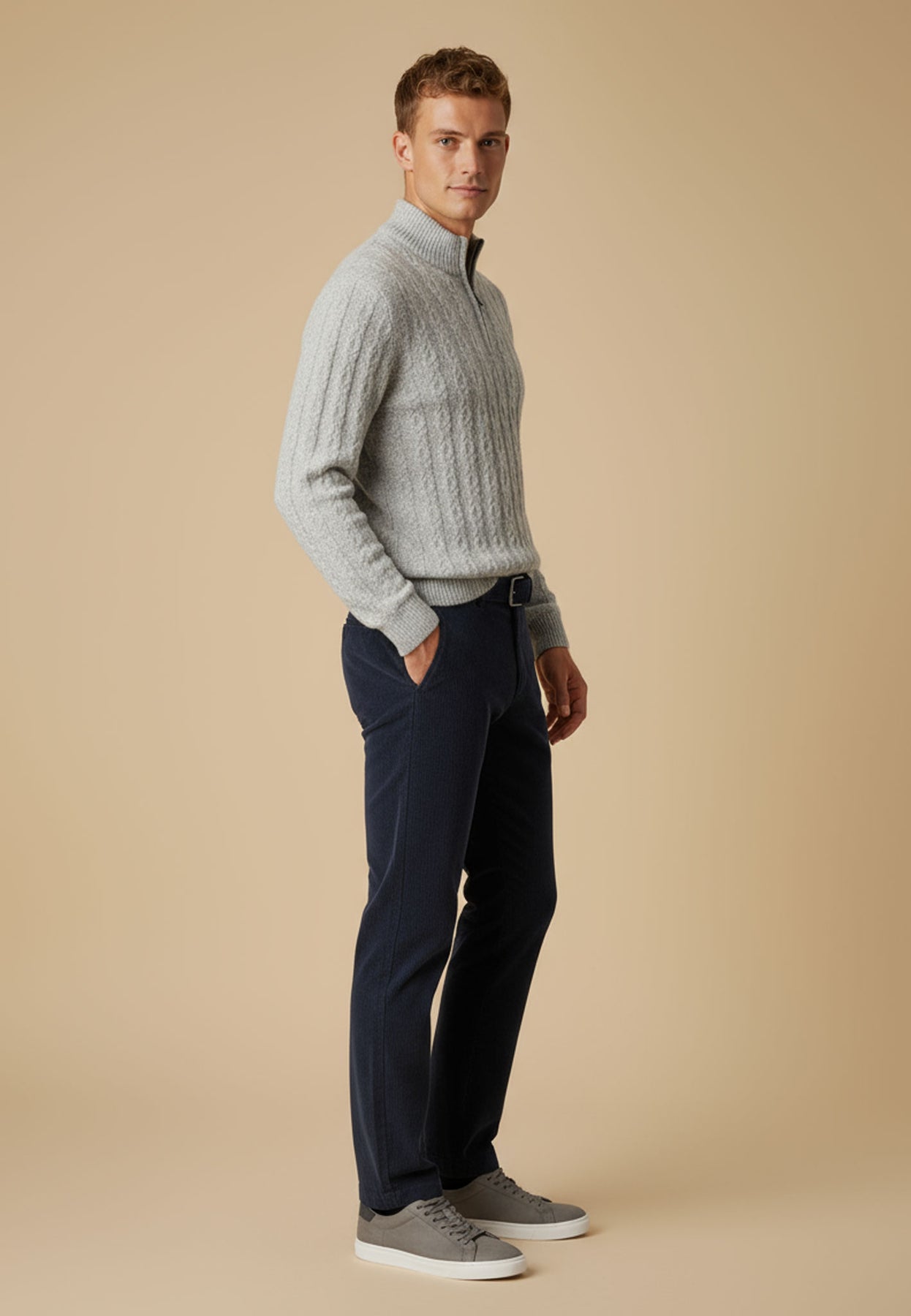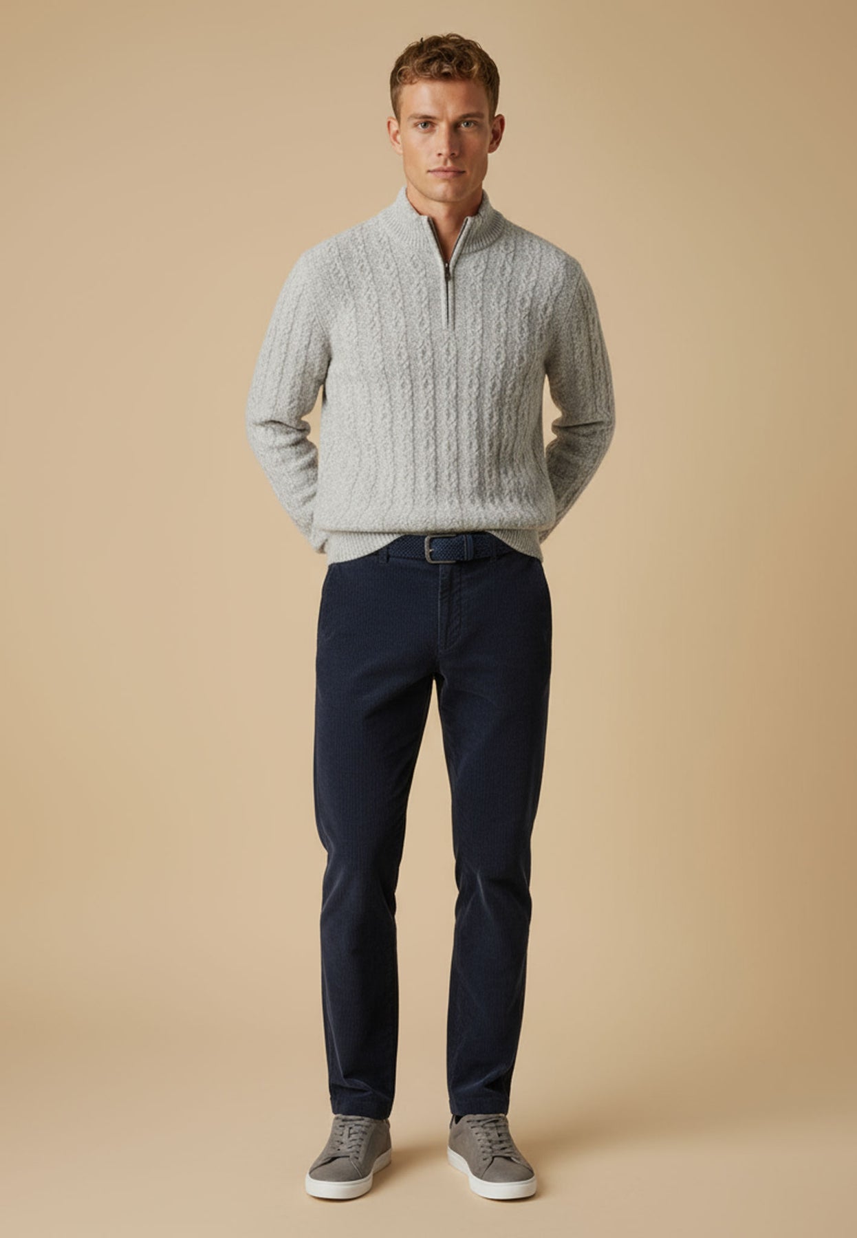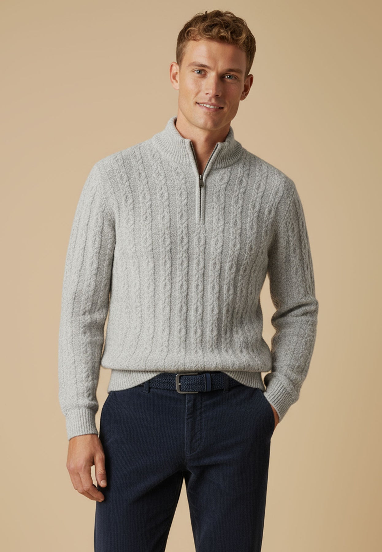Mit seinem traditionellen Zopfmuster und dem kernigen Troyer-Kragen ist dieser Pullover der ideale Begleiter für die kalte Jahreszeit. Der kurze Reißverschluss verleiht dem Design eine sportive Note und sorgt gleichzeitig für Flexibilität beim Tragen.