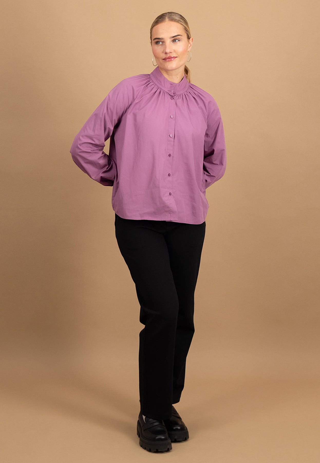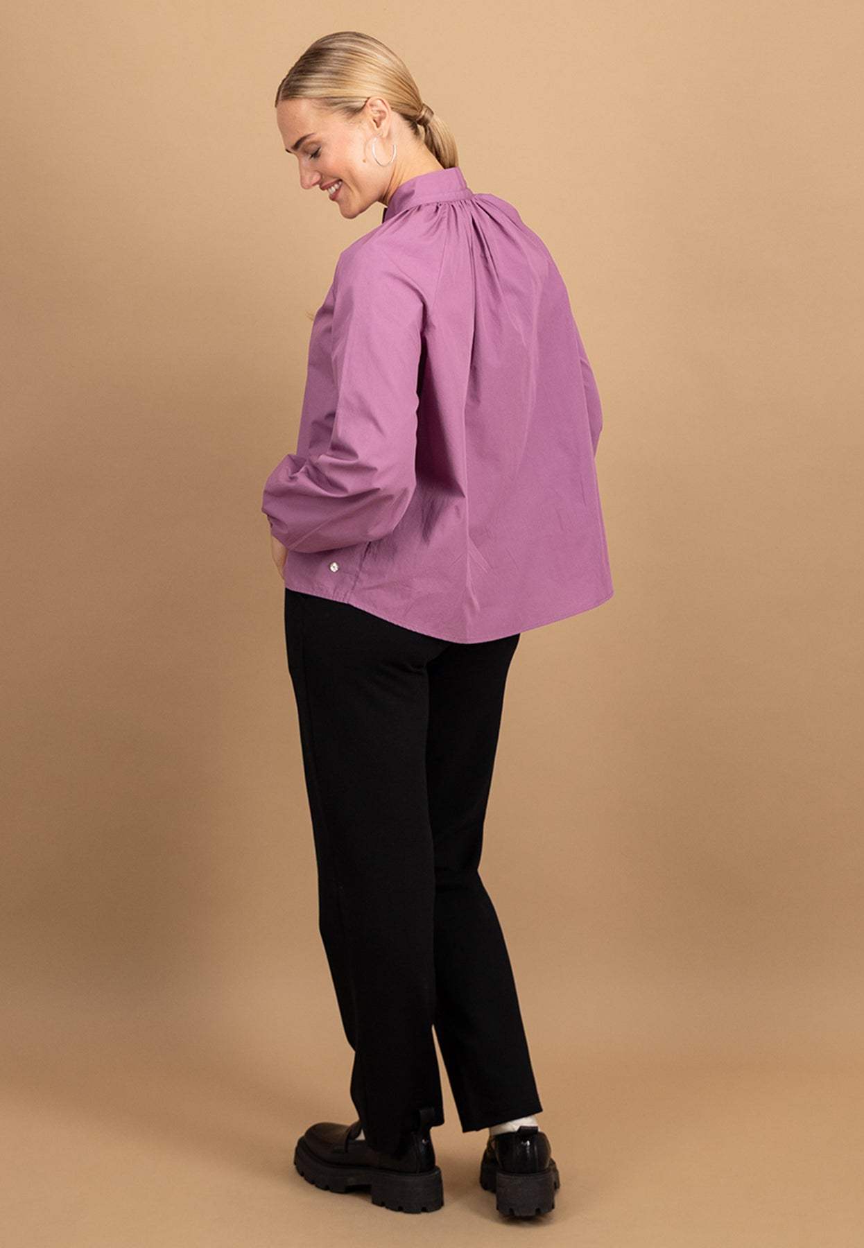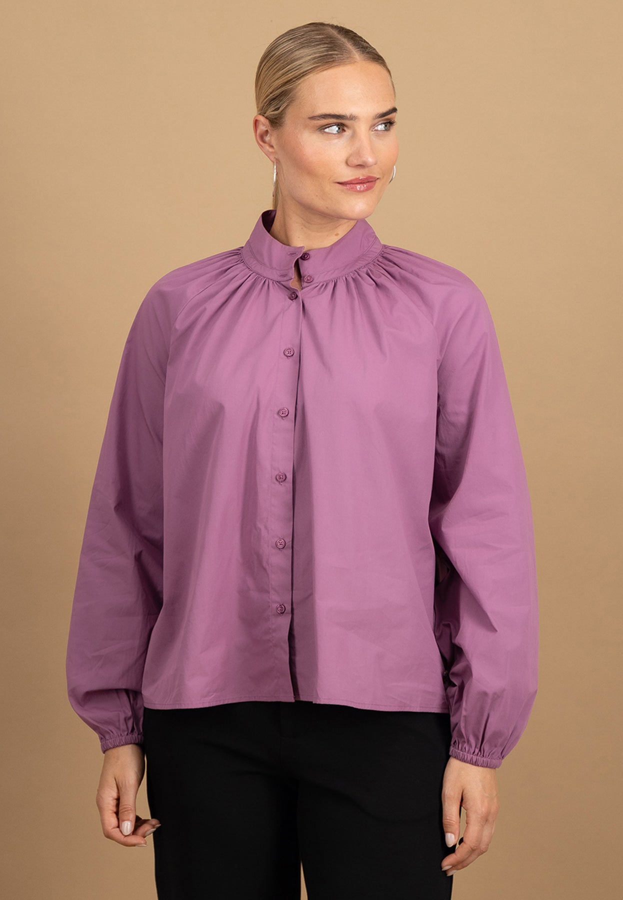 Die feine Faltenlegung am Halsausschnitt und der schlichte Stehkragen verleihen dieser Bluse eine feminine, zugleich moderne Ausstrahlung.