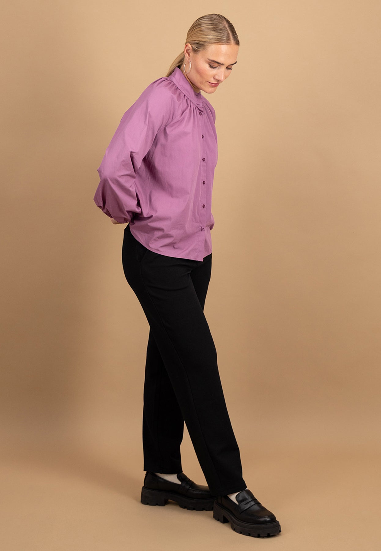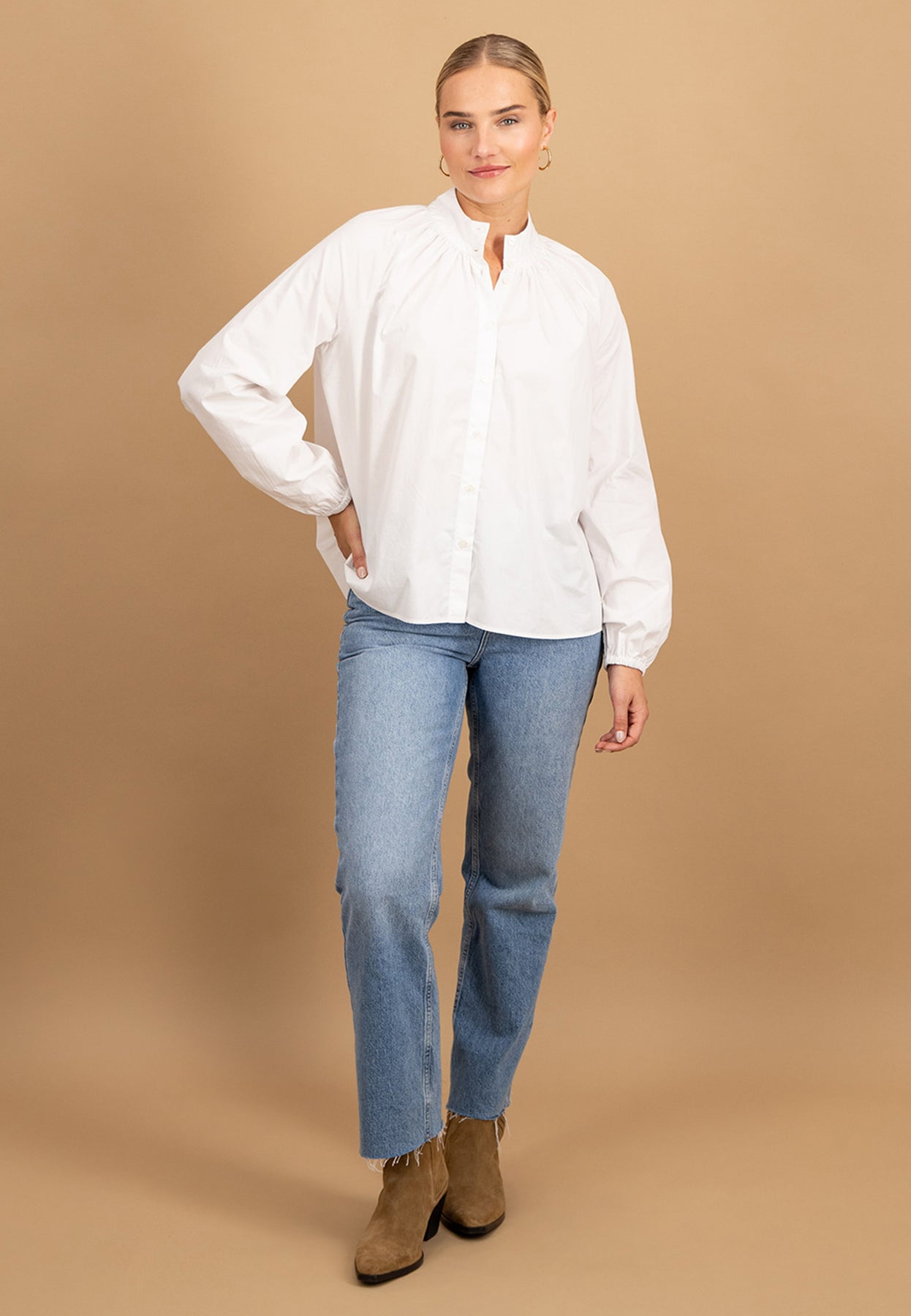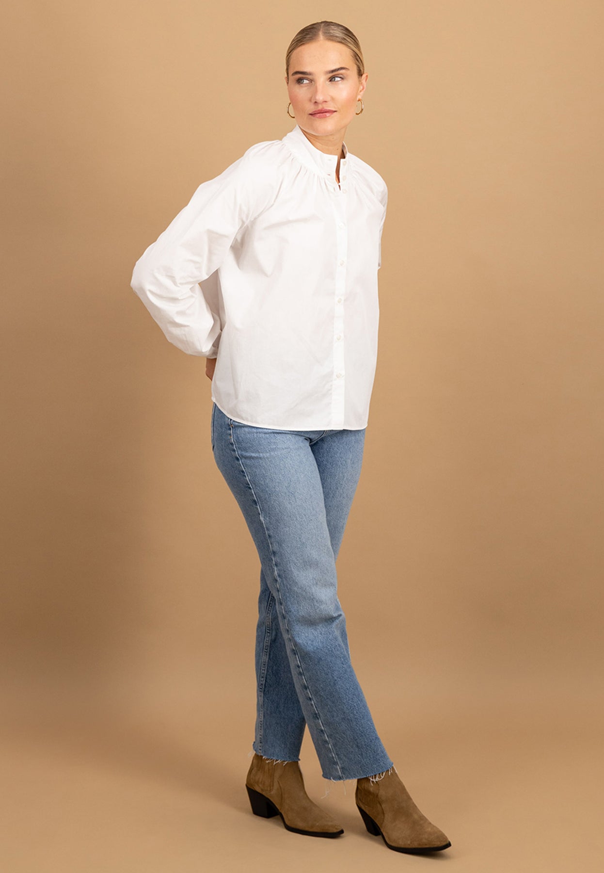 Die feine Faltenlegung am Halsausschnitt und der schlichte Stehkragen verleihen dieser Bluse eine feminine, zugleich moderne Ausstrahlung.