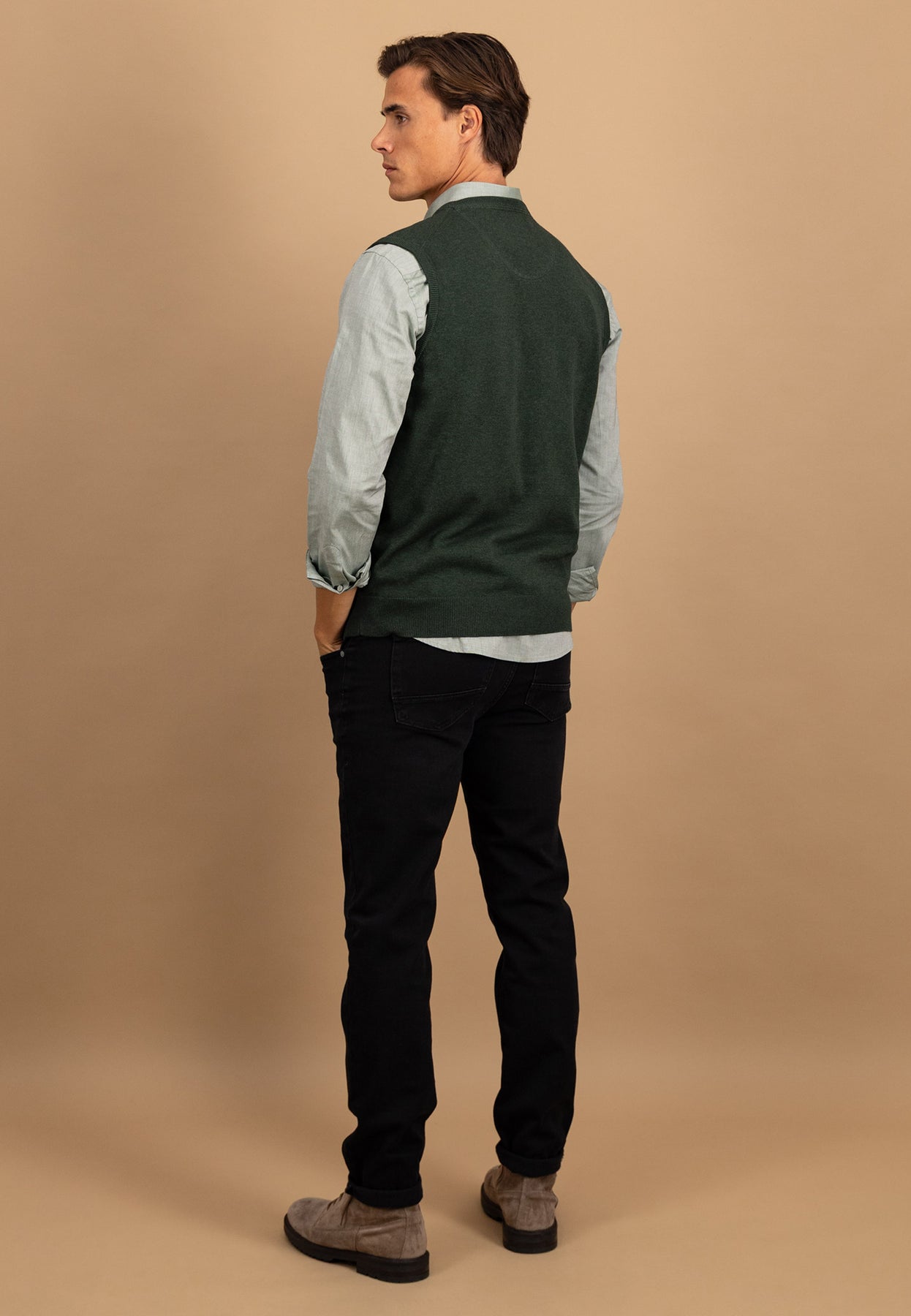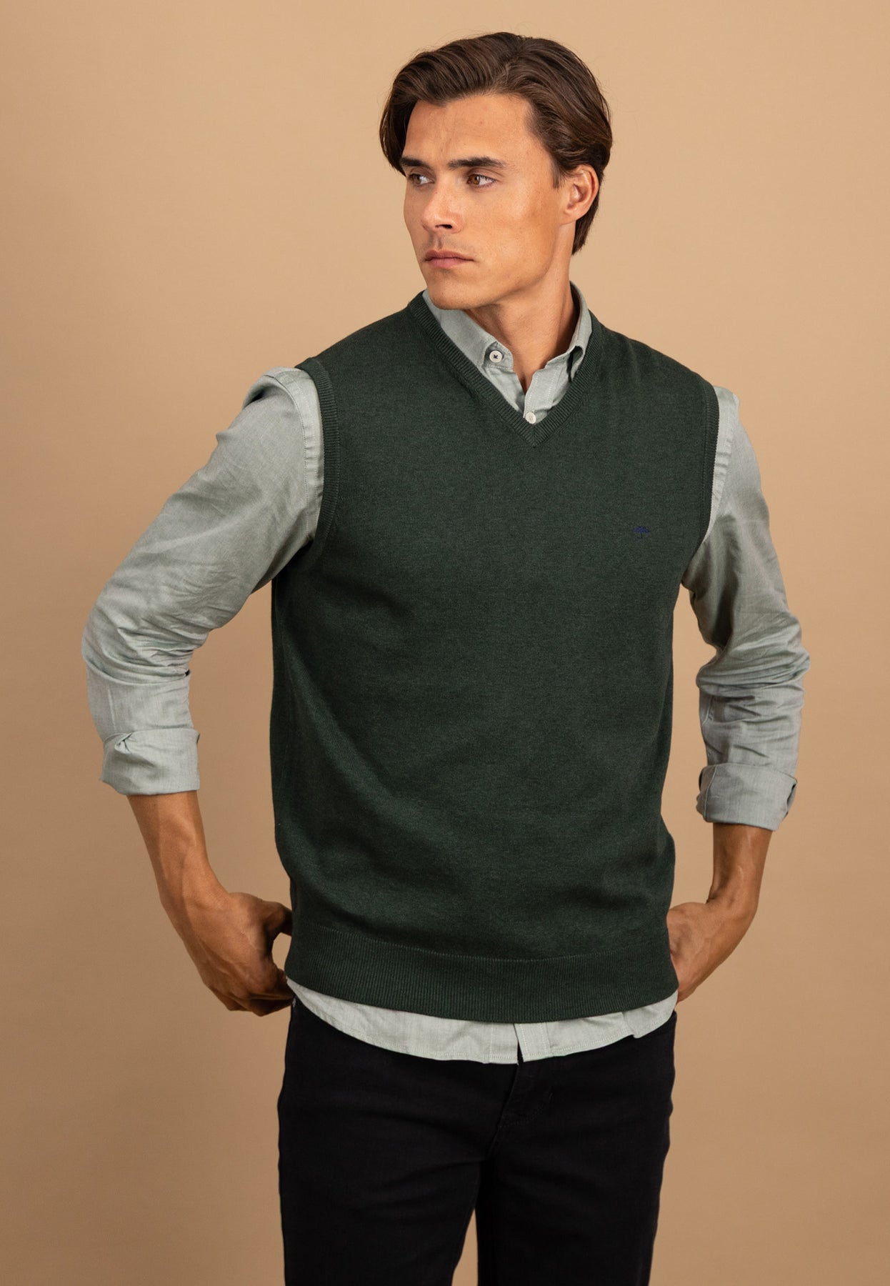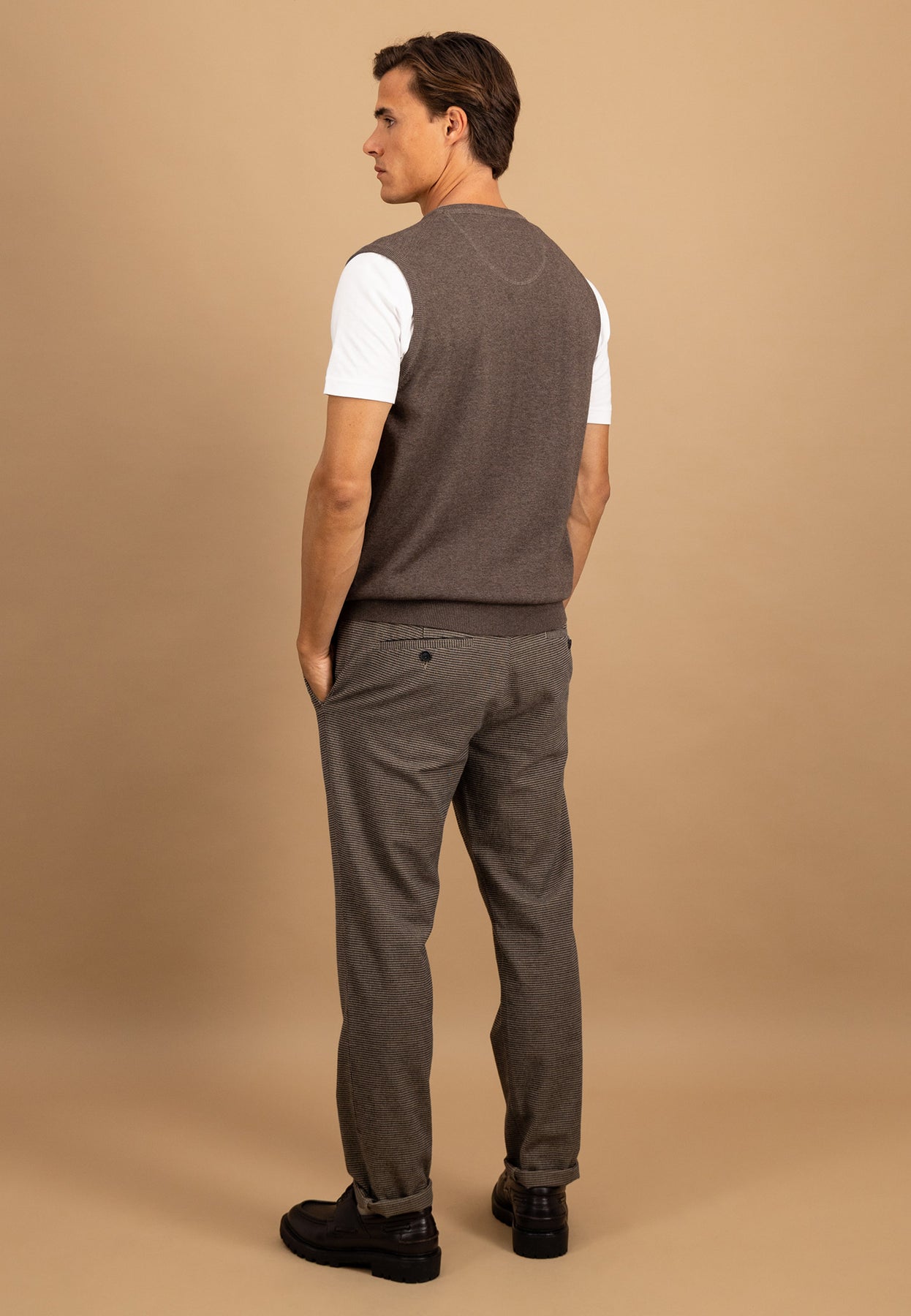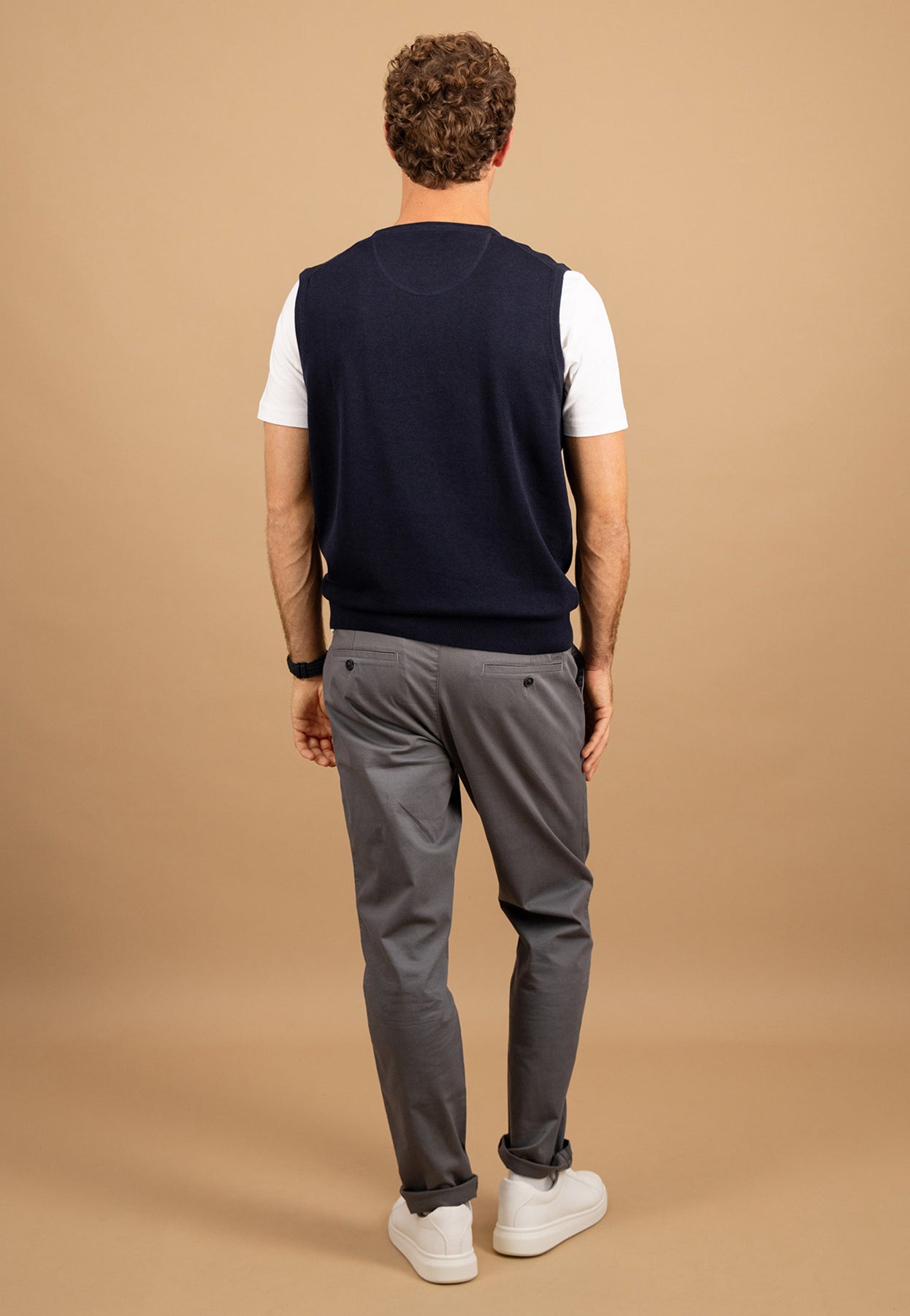 Dieser Pullunder aus 100 % Baumwolle ist ein stilvoller Klassiker für moderne Layering-Looks. Die feine Strickqualität sorgt für hohen Tragekomfort, während der V-Ausschnitt sich ideal mit Hemden oder Longsleeves kombinieren lässt.