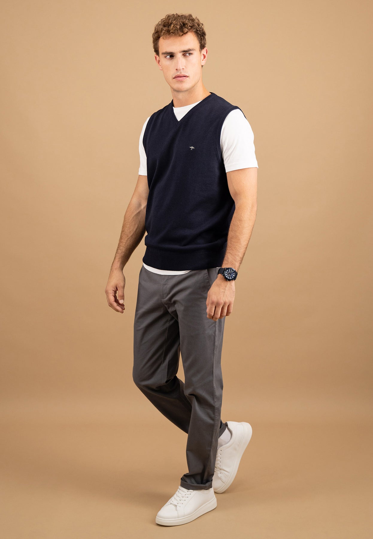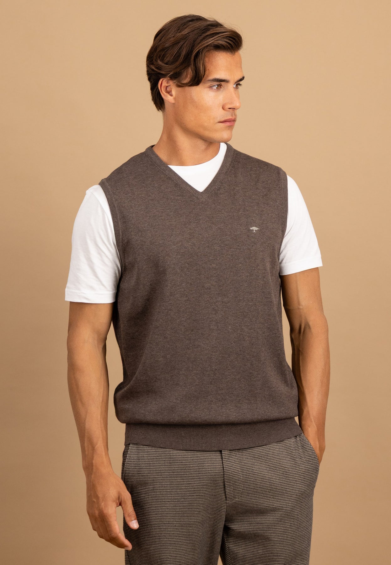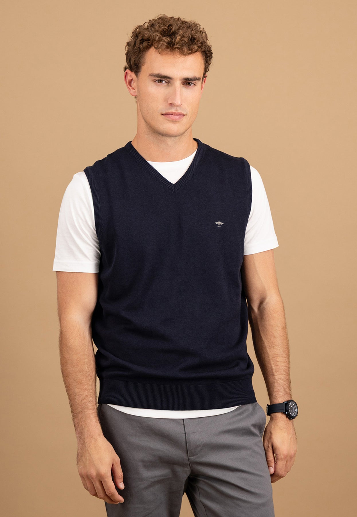 Rippbündchen am Saum gewährleisten einen guten Sitz, und das dezente Logo auf der Brust verleiht dem Modell einen eleganten Markenakzent. Ob für Büro, Freizeit oder Übergangszeit – dieser Pullunder bringt zeitlose Klasse in deinen Look.