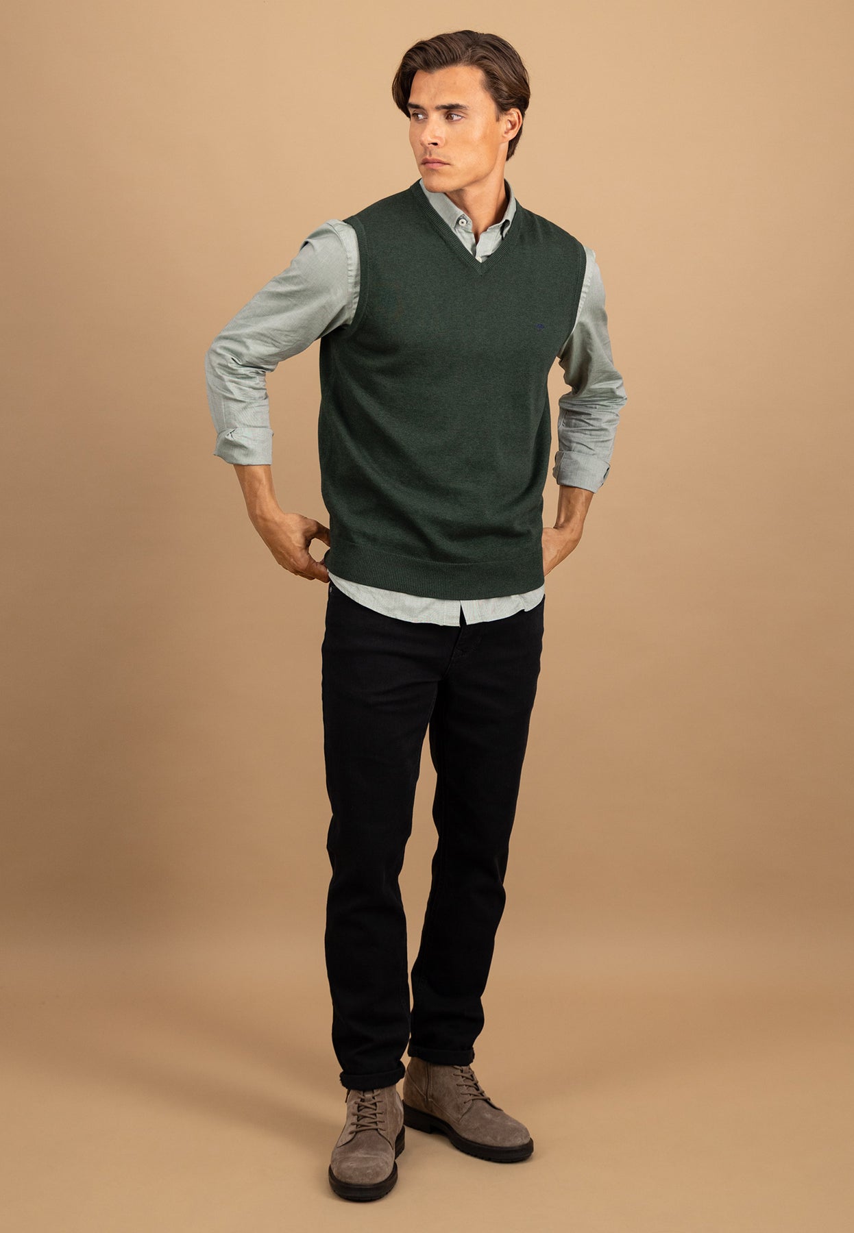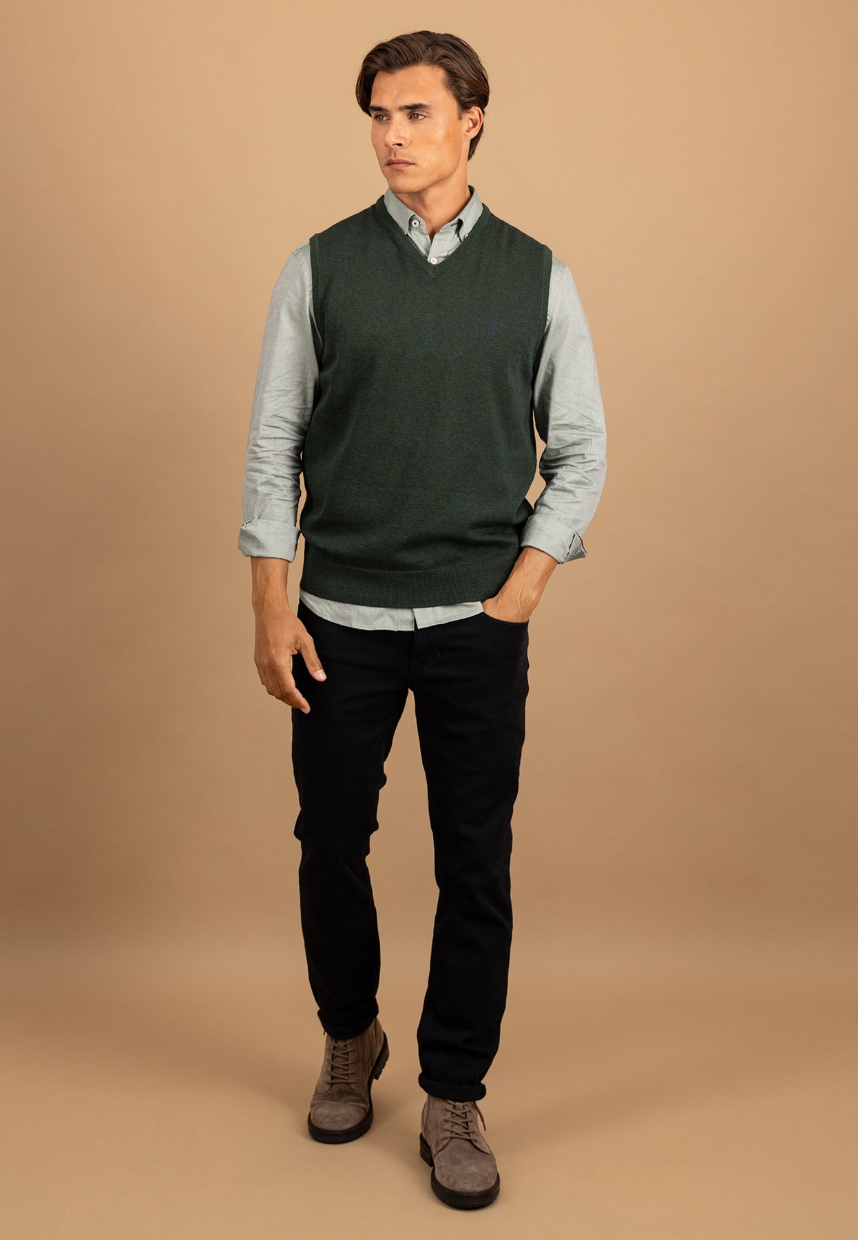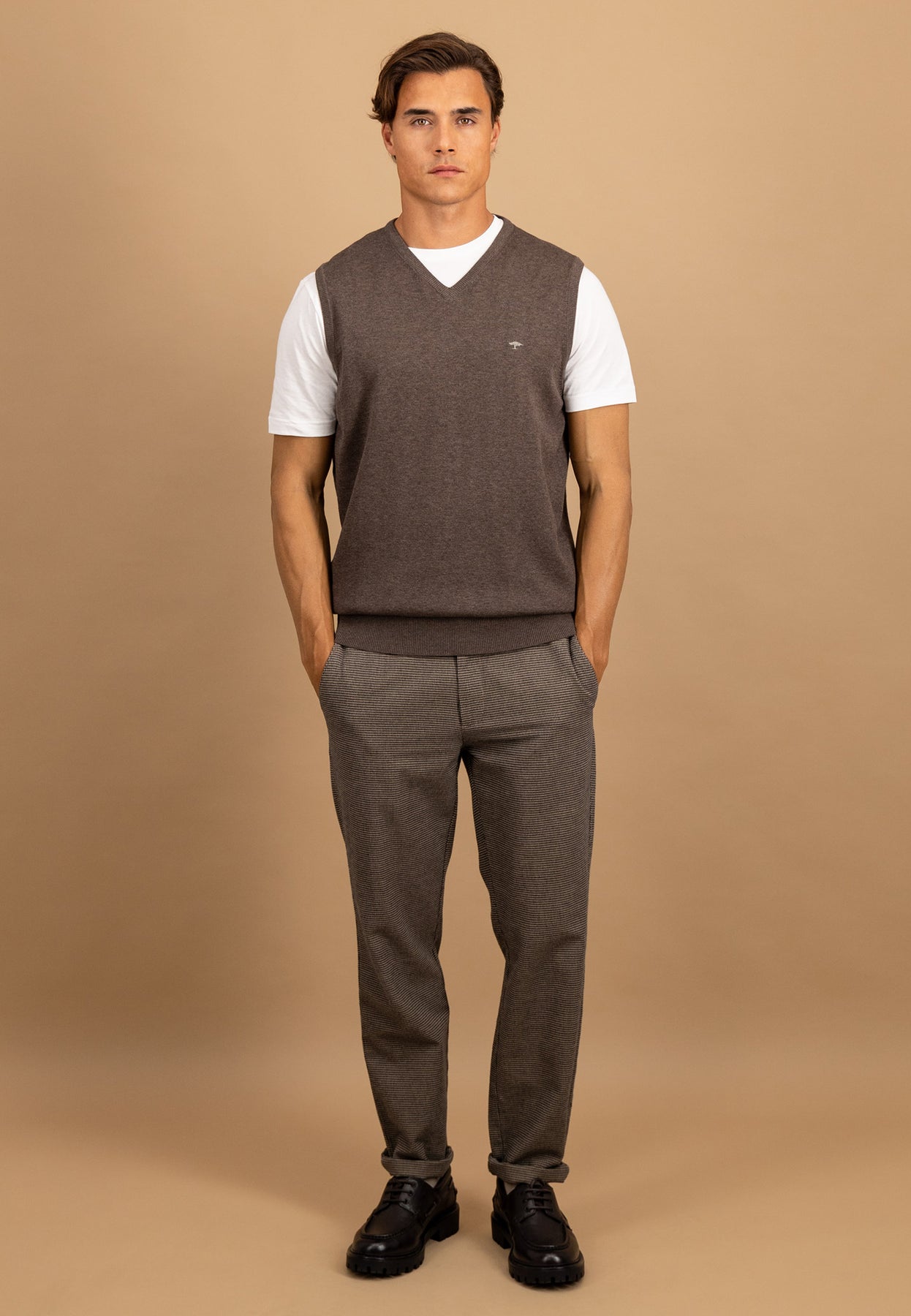 Rippbündchen am Saum gewährleisten einen guten Sitz, und das dezente Logo auf der Brust verleiht dem Modell einen eleganten Markenakzent. Ob für Büro, Freizeit oder Übergangszeit – dieser Pullunder bringt zeitlose Klasse in deinen Look.