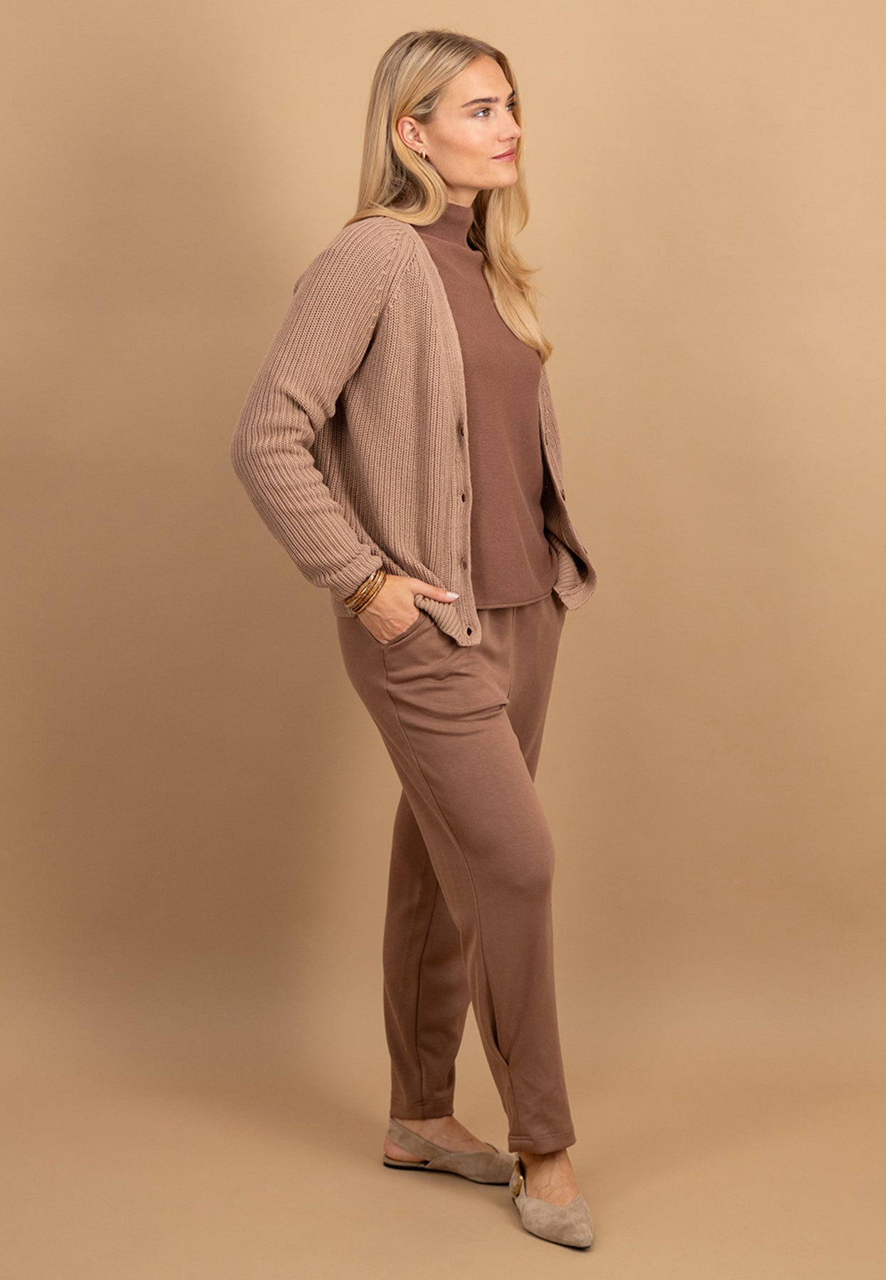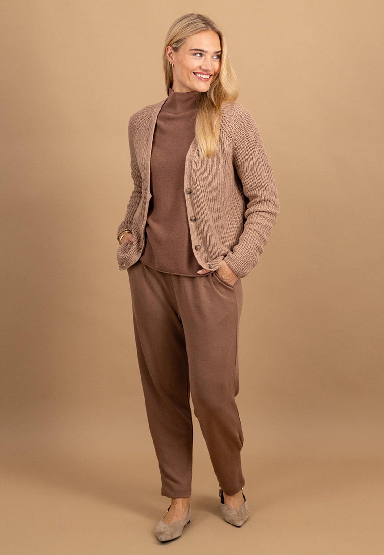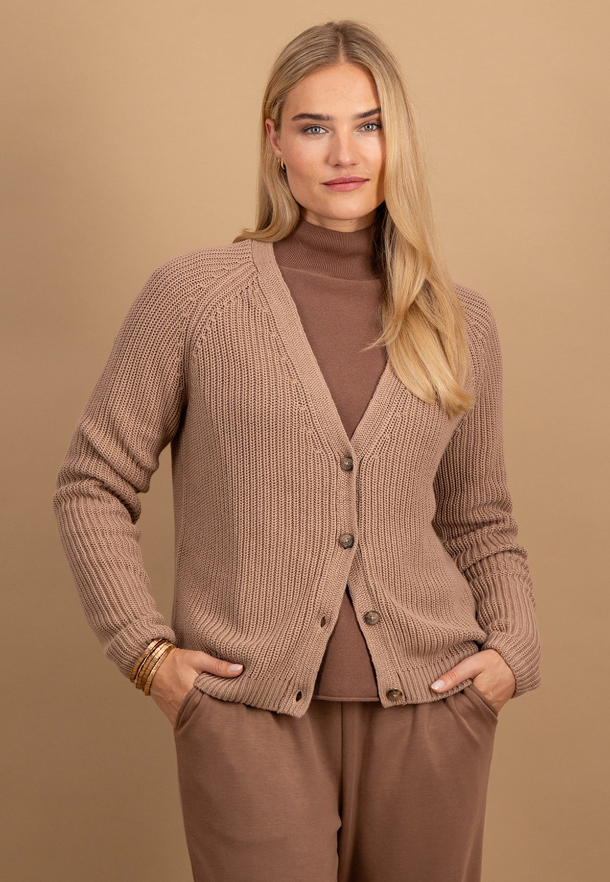 Die grobe Rippenstruktur und der tiefe V-Ausschnitt verleihen dieser Strickjacke eine lässige Note mit femininer Ausstrahlung.