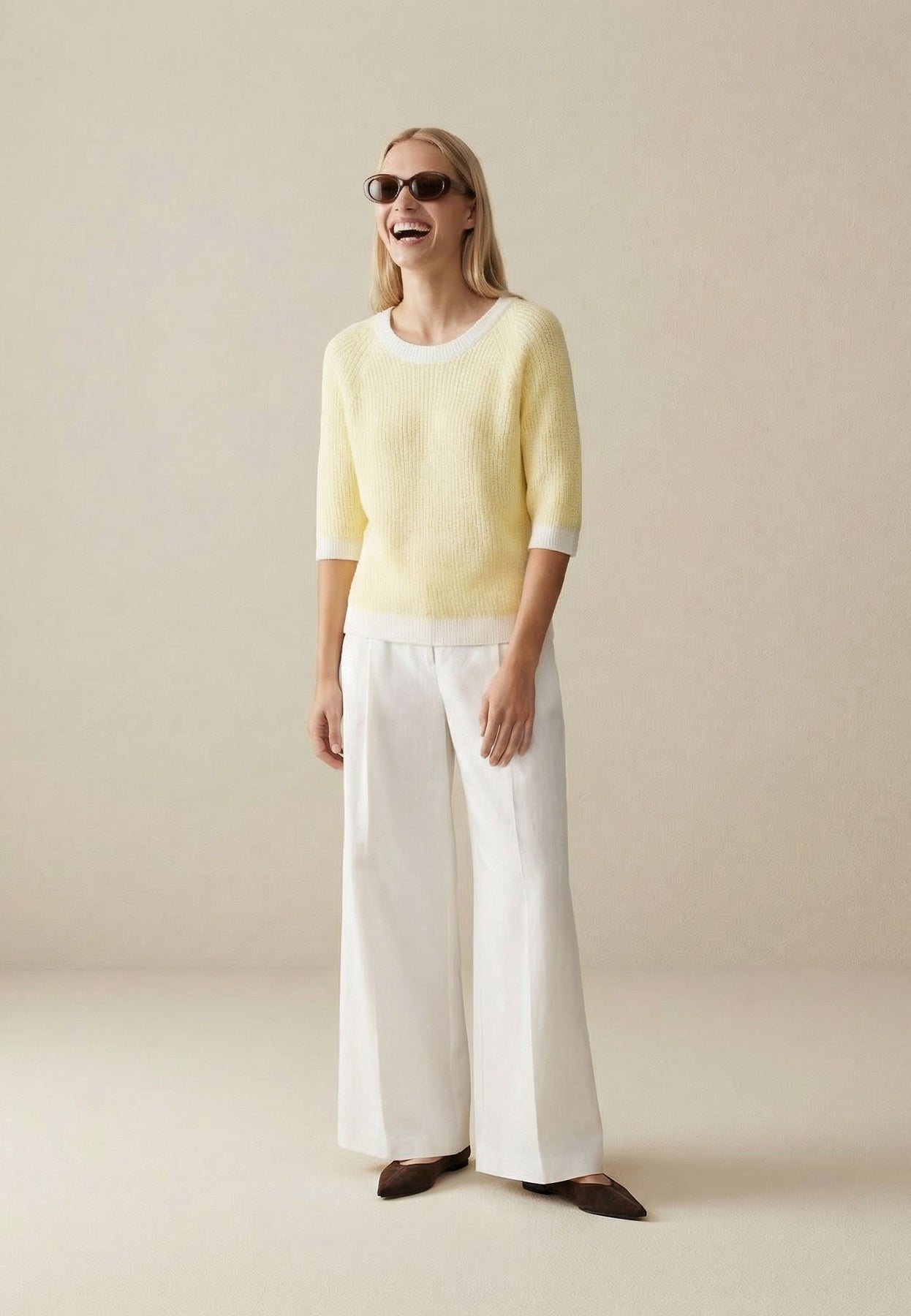Dieser Strickpullover aus einem hochwertigen Wollmix überzeugt mit seiner weichen, leicht flauschigen Oberfläche und angenehmer Wärme. Der klassische Rundhalsausschnitt und die 3/4-Ärmel verleihen dem Design eine moderne, feminine Note, während die feine Struktur für eine schöne Silhouette sorgt. Dank der ausgewogenen Materialmischung trägt sich der Pullover komfortabel und bleibt formstabil. Ein vielseitiges Strickteil für Übergangszeiten und stilvolle Alltagslooks.
