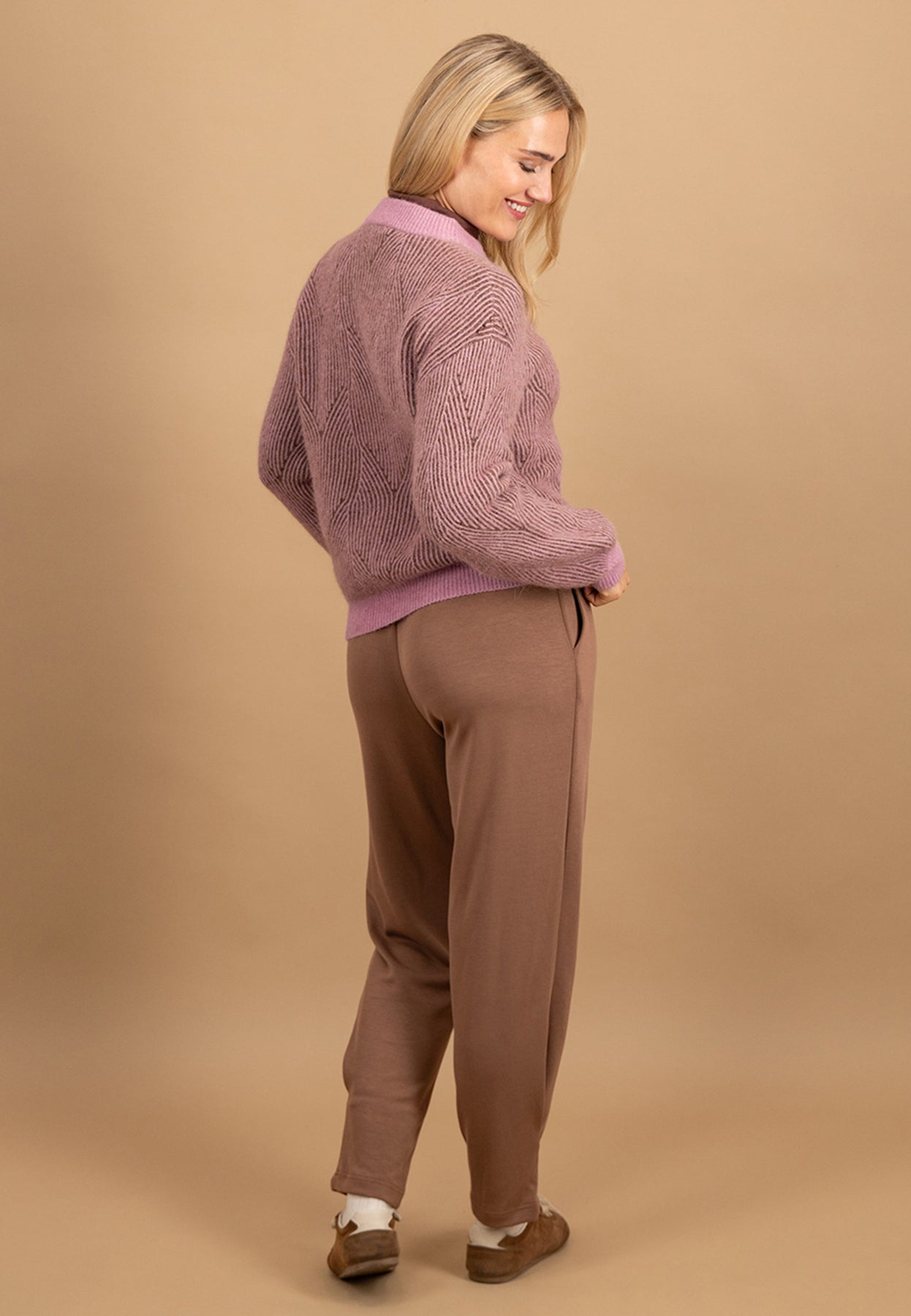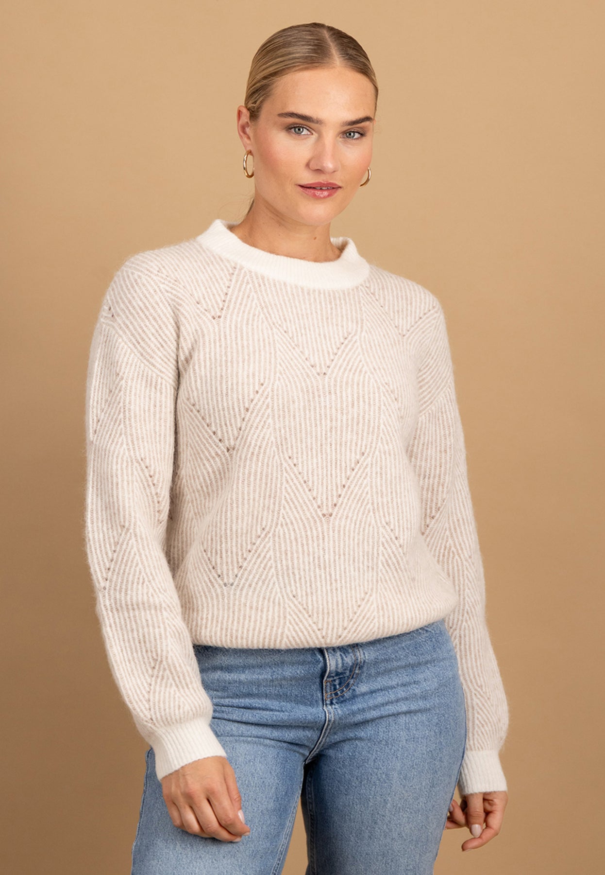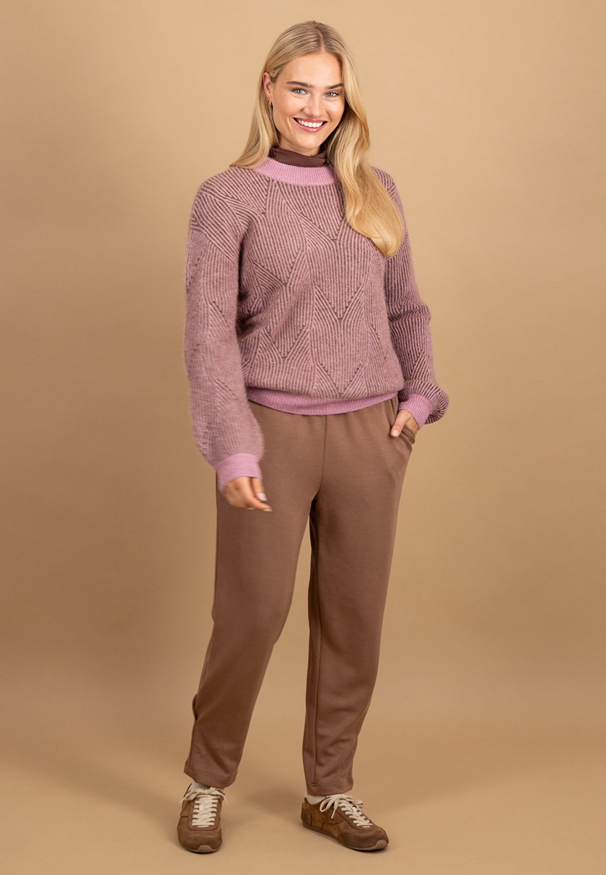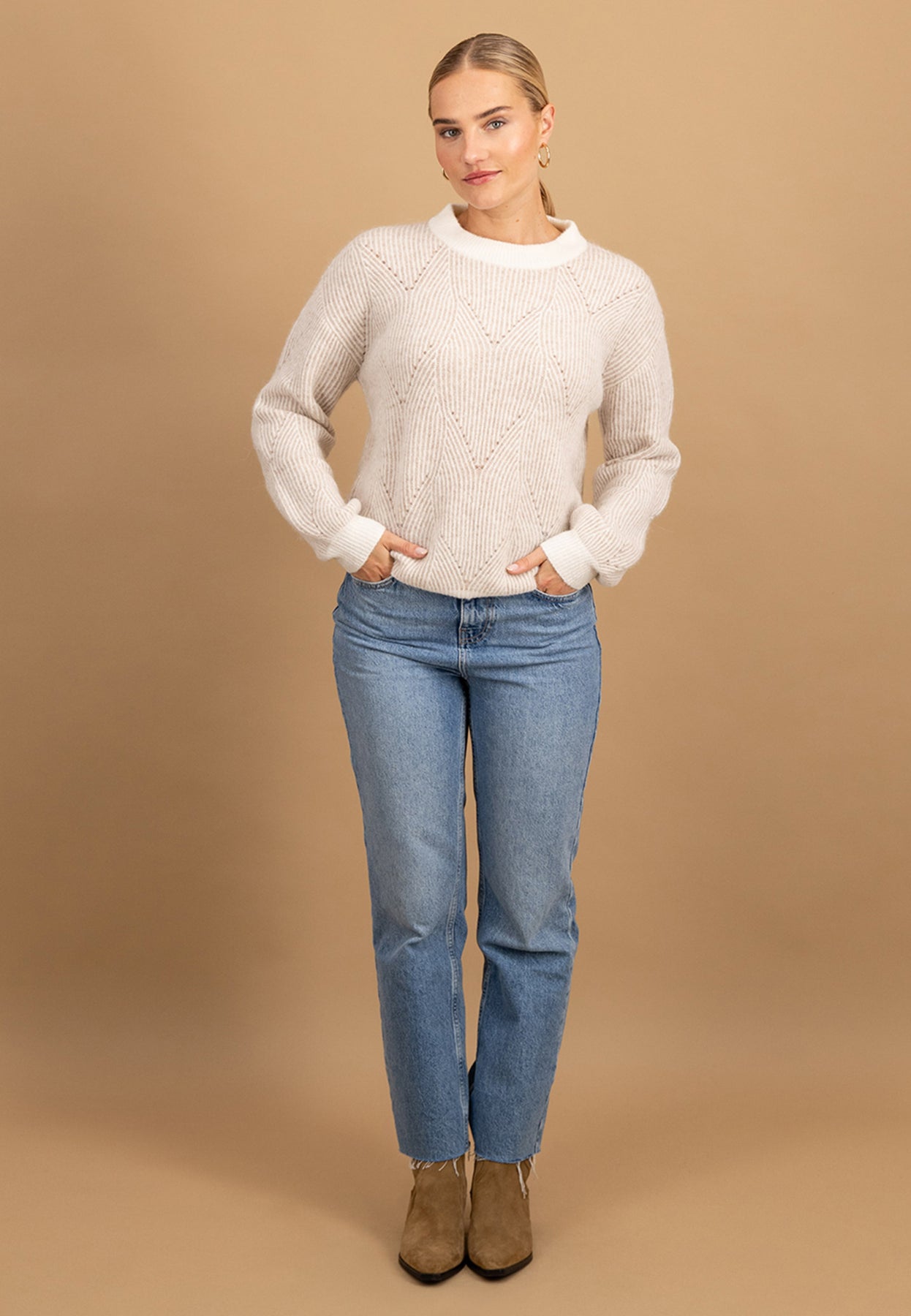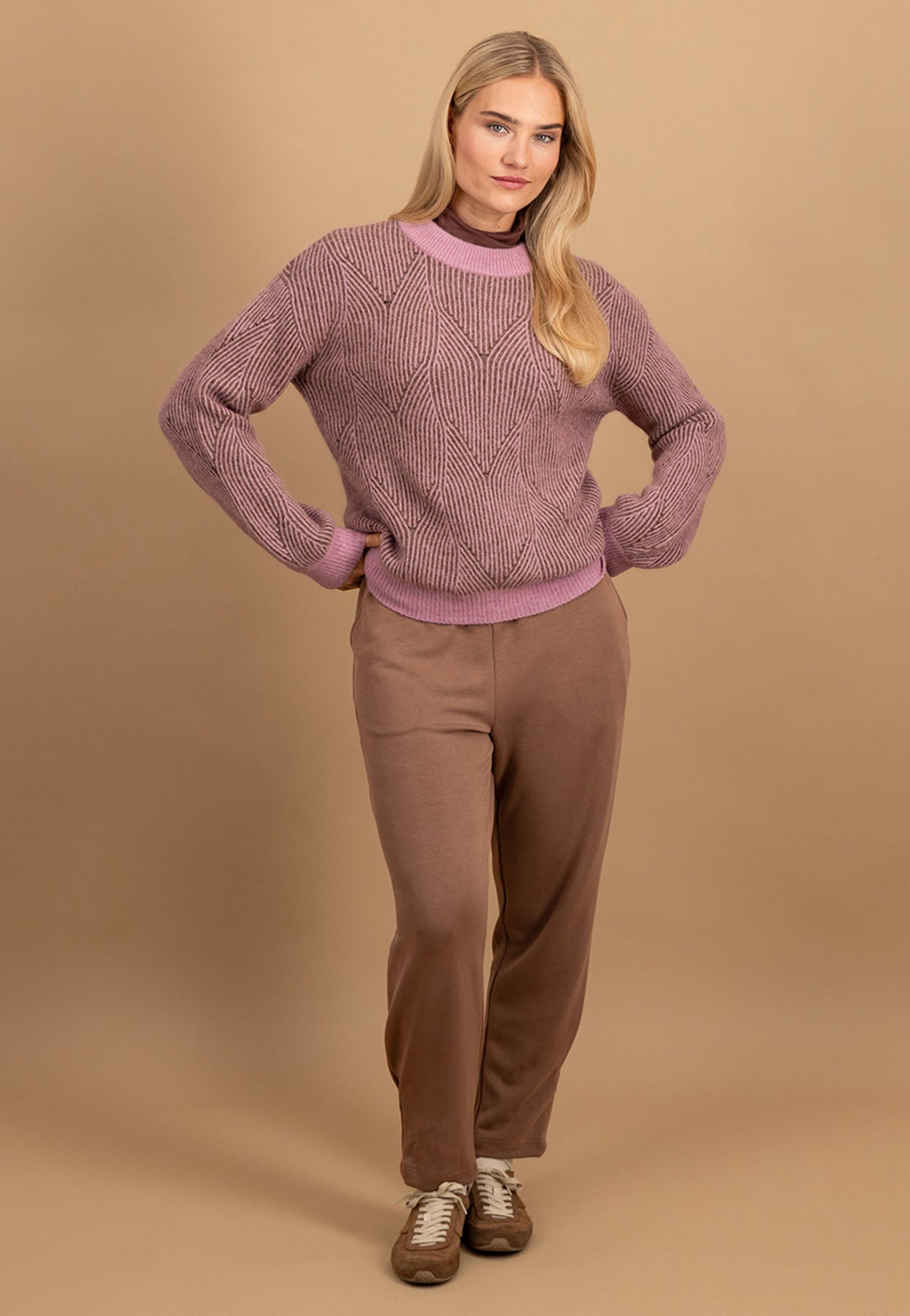 Farblich abgesetzte Bündchen an Ausschnitt, Saum und Ärmeln verleihen dem Pullover einen frischen, femininen Akzent. Die lockere Passform mit leicht überschnittenen Schultern macht ihn zum idealen Begleiter für entspannte Looks mit modischer Note.